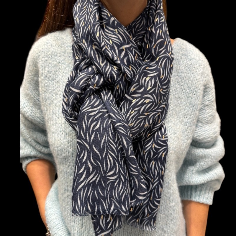 magnifique foulard doux en marine avec motifs doré