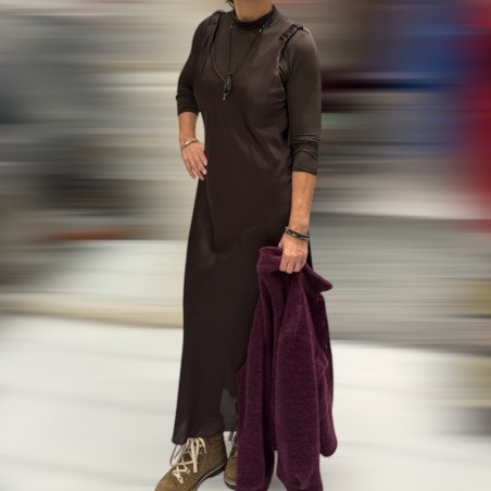 La robe longue en satin fluide à bretelles est une pièce extrêmement polyvalente. Elle peut être portée seule pour un look minimaliste ou accessoirisée pour une tenue plus sophistiquée. Les couleurs marron, chocolat et bordeaux offrent une grande liberté de style, que ce soit avec des bijoux discrets ou des accessoires plus audacieux. Acheter en ligne permet de découvrir de nombreuses inspirations de looks.