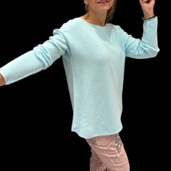 Un pull bleu ciel légèrement cintré est une pièce idéale pour composer des tenues élégantes et faciles à porter. Il peut être associé à un jean, un pantalon habillé ou une jupe pour créer des looks variés. L’encolure ronde et les manches longues offrent une grande polyvalence stylistique, tandis que la couture le long du bras ajoute une finition chic.