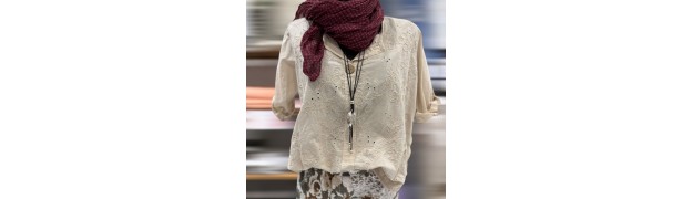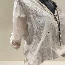 Le chemisier brodé beige est parfait pour celles qui recherchent un équilibre entre confort et élégance. Son tissu léger est agréable à porter au printemps, tandis que les broderies apportent du caractère sans alourdir la tenue. L’encolure V met en valeur le port de tête, et la coupe plus longue derrière crée une ligne fluide et flatteuse. Les manches réglables permettent d’adapter le style selon les envies.