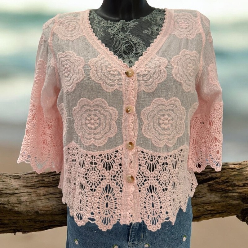 Ce type de chemisier est idéal pour créer des looks printaniers évolutifs. Il peut être porté seul pour un effet sophistiqué ou ouvert sur un top pour un style décontracté. Sa coupe courte met en valeur la silhouette tandis que la broderie apporte une texture raffinée, parfaite pour les journées ensoleillées.