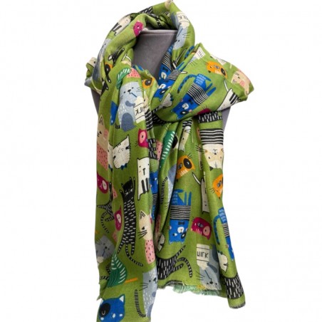 5. Écharpe fantaisie en viscose avec chats verts et beiges : une touche de douceur et de gaieté