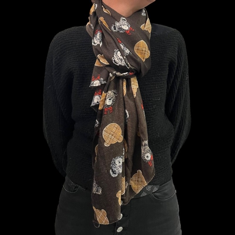 1. Écharpe marron en viscose à motifs d’oursons : un cadeau d’hiver doux, original et plein de tendresse