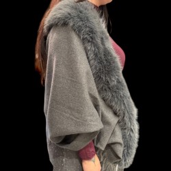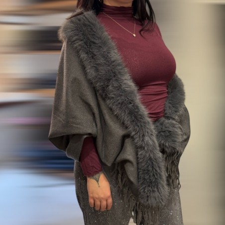 2. Cape ou écharpe grise toute douce avec franges et fourrure synthétique : pourquoi en faire votre achat en ligne incontournable cet hiver ?
