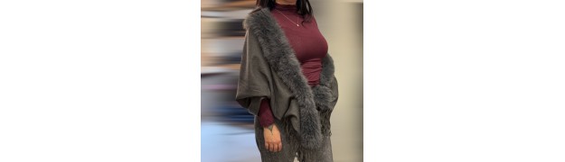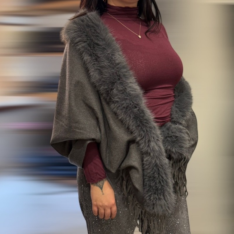 7. Pourquoi choisir en ligne une cape ou écharpe grise toute douce ornée de franges et fourrure synthétique pour un look chic d’hiver ?