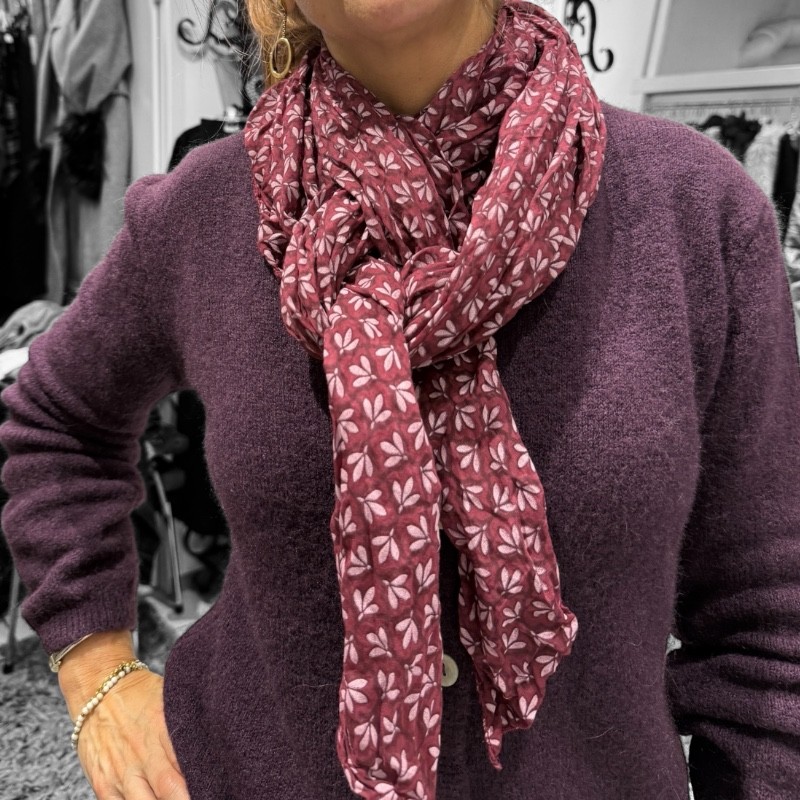 1. Pourquoi acheter en ligne un foulard bordeaux en coton et soie avec motif imprimé pour profiter d’un accessoire élégant, doux et intemporel à porter toute l’année