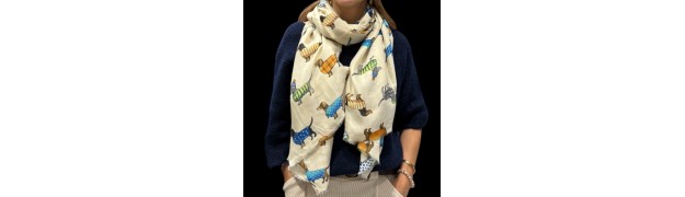 3. “Pourquoi acheter sur Internet une écharpe en viscose beige avec de petits chiens colorés pour ajouter une note créative à vos looks du quotidien ?”