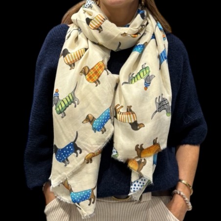 8. “Pourquoi acheter sur Internet une écharpe beige en viscose avec chiens colorés pour offrir un cadeau original et plein de douceur ?”