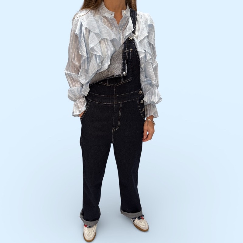 La salopette en denim bleu foncé avec bretelles ouvertes sur le devant est devenue une pièce phare du style casual chic. Elle associe le côté pratique d’un vêtement utilitaire à une esthétique moderne et élégante. Les boutons sur les côtés ajoutent un élément de design qui attire l’attention tout en facilitant l’habillage.