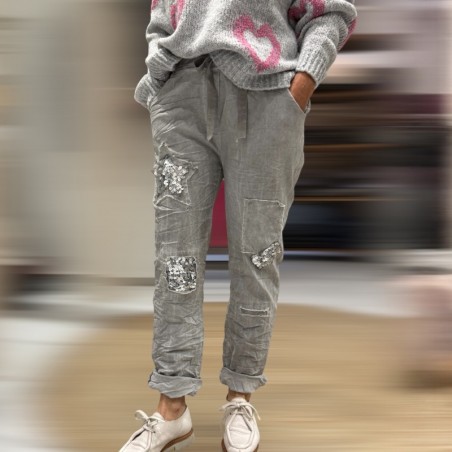 Le motif étoile évoque la liberté, la lumière et le rêve. En choisissant un pantalon gris décoré de sequins, vous ajoutez une dimension féerique à votre style. Ce vêtement se porte aussi bien en journée qu’en soirée, selon les accessoires que vous lui associez.