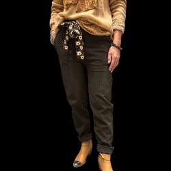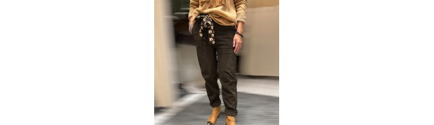 La ceinture en tissu fleuri apporte la touche finale qui distingue ce modèle des pantalons classiques. Elle réhausse le marron par une explosion de couleurs et de motifs. Ce contraste harmonieux crée un effet stylé et original, parfait pour celles et ceux qui veulent affirmer un goût raffiné et authentique.