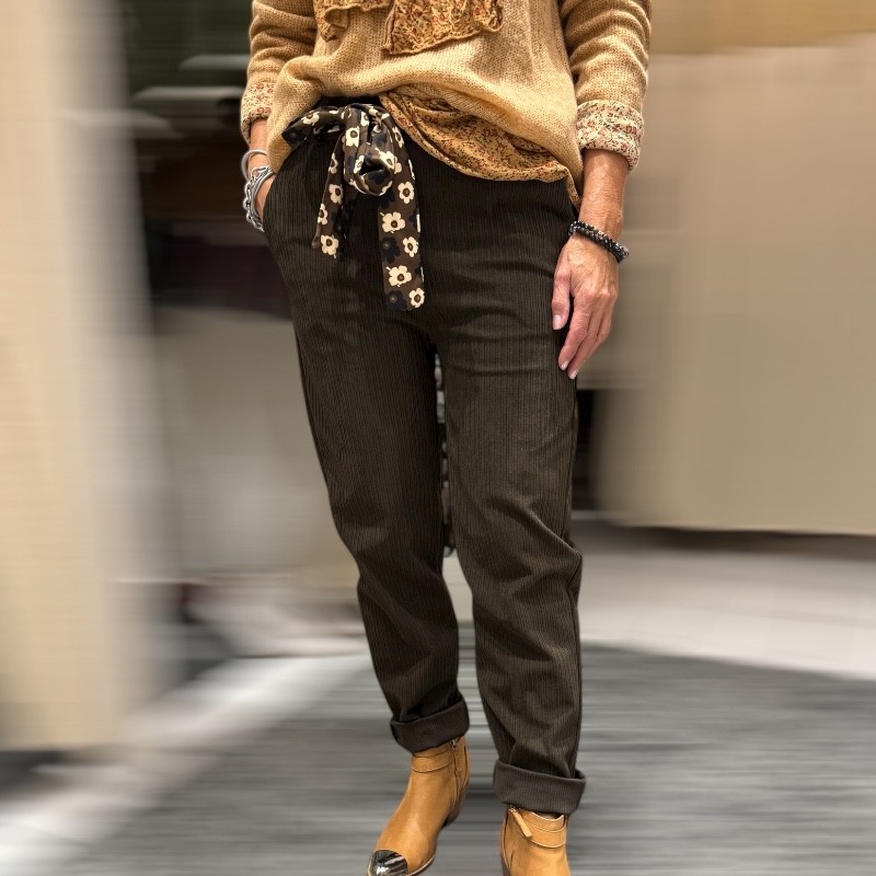 6. Pantalon en velours marron avec ceinture fleurie : l’élégance naturelle du style automnal