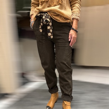 La ceinture en tissu fleuri ajoute une touche artistique et romantique qui contraste magnifiquement avec la sobriété du velours marron. Ce détail transforme un simple pantalon en véritable pièce de caractère, parfaite pour exprimer sa personnalité avec subtilité. Un achat en ligne malin pour un look raffiné et unique.