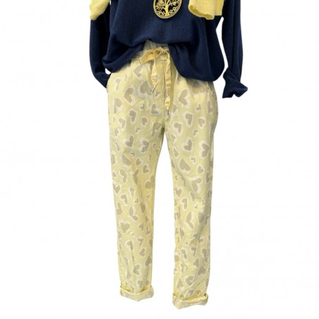Un pantalon stretch jaune clair à cœurs avec deux poches côtés et deux derrière est parfait pour affirmer un style joyeux et original. Sa teinte lumineuse attire la lumière, tandis que les motifs cœurs créent un effet visuel dynamique et féminin. Cette pièce se distingue facilement dans une garde-robe.