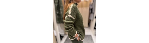 Le pull kaki est une valeur sûre pour l’hiver, capable de s’adapter à tous les styles. Les coutures beiges créent un joli contraste, soulignant la finesse du travail artisanal. Le col cheminée ajoute un confort thermique optimal, parfait pour les journées froides.